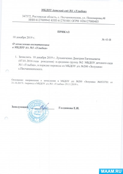 Приказ №43 от 10.12.2019 о зачислении Лукьянченко Д.Е.