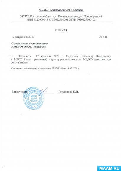 ПРИКАЗ о зачислении воспитанника в МБДОУ д/с №1 "Улыбка" от 17.02.20г.